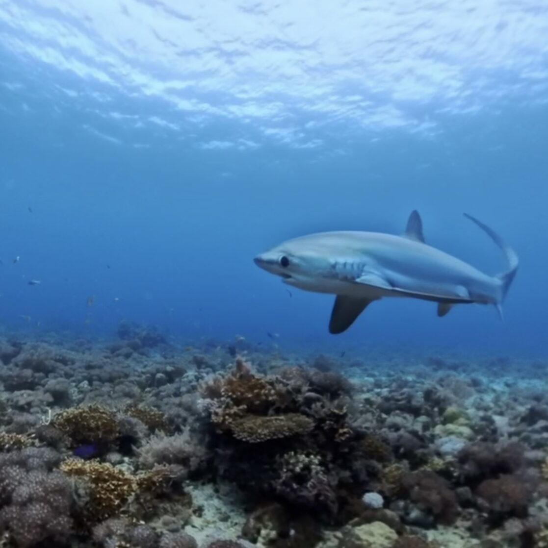 After my time with CCEF I went to Malapascua, a tiny island North of Cebu, with one aim: to see a thresher shark. I have always wanted to see these sharks, but they are pelagic, live very deep, and are hard to see. Malapascua is very special because it is the only place in the world where you have 98% of chance to see one! The reason is that there is a seamount that thresher sharks like to use as a cleaning station, so every morning they will swim up and stay for a couple of hours while they are being “cleaned” by other fish. When I knew I was going to be close, I knew I had to try and see one. I stayed at Kokay´s Maldito Dive Resort. I had met the owner, Ritchel, at DEMA, and she was very kind to invite me and allow me to join them. I loved my stay with them because all the staff were super nice and friendly. In my first dive, I was super nervous and was scared I was going to be one of the 2% of chance who would not see a thresher shark… but just after 5 minutes, I distinguished the majestic shark with its very long emblematic tail! I could not believe how beautiful and elegant it was! Then we found more and more of them. On all the dives I was surrounded by sharks– it felt like a dream! In between dives, I even saw them jump out of the water! It was the perfect closure to my incredible time in the Philippines!