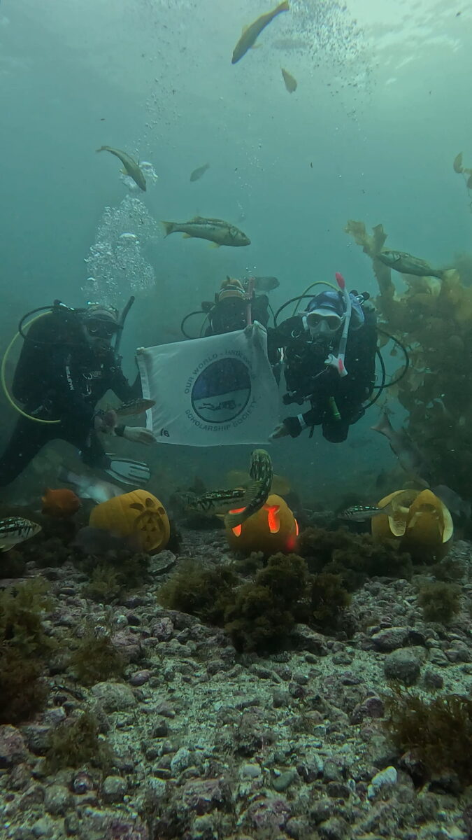 After some days, I went to the other side of the island and visited Avalon, where I met Jemma Paradise, the 2025 Photography Intern who works at Catalina Divers, and Kayla. I did some dives with them and explored different dive sites in Catalina, and because Halloween was approaching, we finished the day with an underwater pumpkin-carving contest! It was my first time pumpkin carving, and the underwater factor plus the loads of fish trying to eat the pumpkin made it even harder, but it was a very fun and unique experience.
